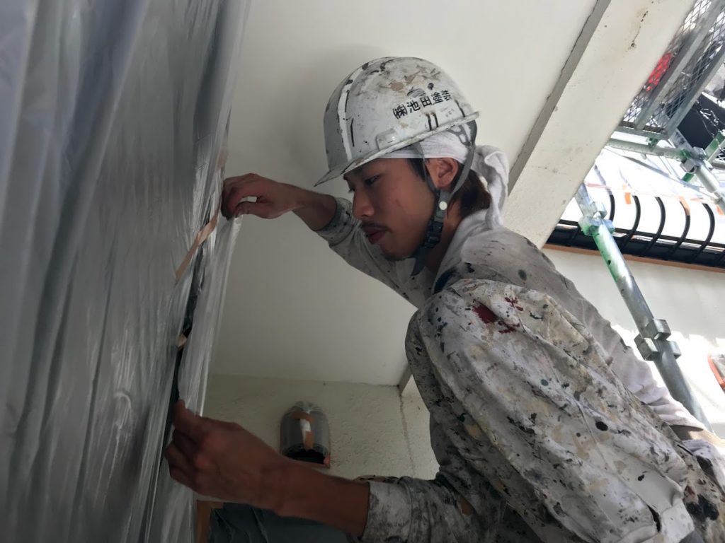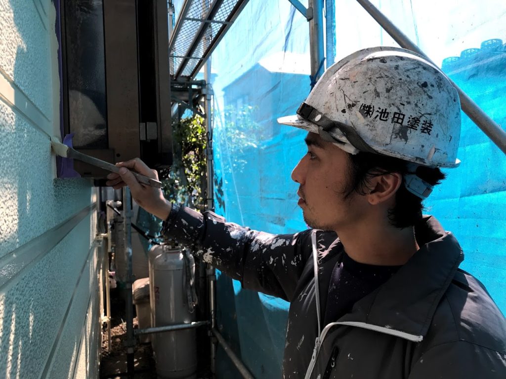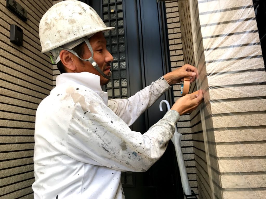 こちらのお宅は外壁のひび割れが多く、下地の状況があまりよくないので通常1回の下塗りを2回行う予定です。養生作業が終了後、1回目の下塗り作業に入ります。