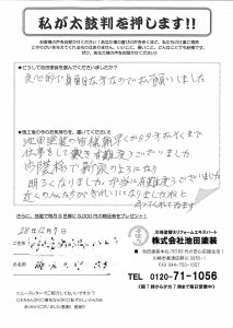 池田塗装の皆様朝早くから夕方おそくまで仕事をして戴き有難うございました。お陰様せ新家のようになり明るくなりました。本当に有難うございました。近くの人たちがきれいになりましたねと言ってくれています。