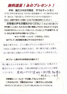 193どうして、当社を選んでくれたのですか? 塗装工事だけは、どこに頼んだらよいか悩みのタネです。 今回はご近所での工事振りを見て、若い親方の話を聞き、 古い家の雨と太陽からの守りを託してみようと決めました。   ★リフォーム後の今のお気持ちを教えて? 若い職人さんの手を省かない(そう確信させる)仕事ぶりと194 親方のフォローの結果、工事は期待通りに仕上がったと納得 しています。 屋根のガイナ塗料の断熱効果を期待しています。
