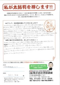 せっかくやるリフォーム、絶対に損はしたくない!と思って色々調べて何社か見積りを取りましたが、見積りが一番丁寧だったこと、聞いたことに対してすぐに答えてくれたり誠実そうだなというのが伝わってきました。会社のHPも拝見して実際の施工が多くのっていたのも安心感ありました。他社では接客態度が完ペキバリバリ営業マン!で流暢に話されているところもあって普段接客業をしている私としても「話うまいなー」と感心はしていましたが、営業トークというのが見えて腑に落ちず、でも池田塗装さんは、営業トークではない職人目線でアドバイスなどがいたる所にあって、はじめは警戒していましたが(笑)気づいたらこちらから色々質問していました。1F部分のみカバー工法、2Fは塗装、という提案をして下さったので費用も考えていた位になったのでお願いしました。天野さん色々とありがとうございました!!