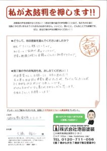 池田塗装さんにお願いして本当に良かった!!元の色とほぼ同じ塗装を選びましたがキレイになったことがよくわかる仕上がりでうれしいです。ガイナのおかげで少し暑さがやわらいだと思います。今後ともよろしくお願いします。
